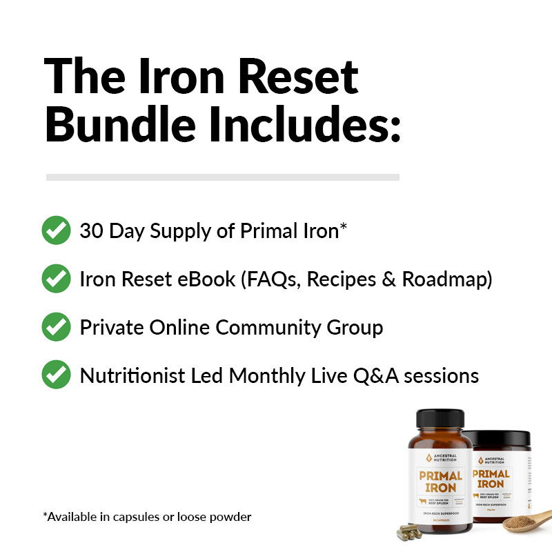 The Iron Reset Bundle includes a 30-day supply of Primal Iron along with The Iron Reset eBook written by Clinical Nutritionist Emily Collyer. You’ll also gain access to a private Facebook community with monthly live Q&A sessions hosted by a qualified nutritionist — giving you the tools, education, and support to build better iron habits naturally.
