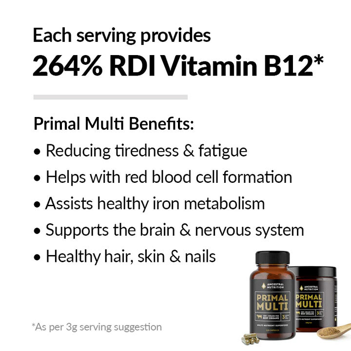 The information presented on this page is provided for general educational purposes only and is not intended to diagnose, treat, cure, or prevent any disease. Statements about Primal Multi — Grass-Fed Beef Organs and other Ancestral Nutrition products have not been evaluated by the Therapeutic Goods Administration (TGA). These products are sold as foods/dietary supplements and are regulated under the Australia New Zealand Food Standards Code; they are not registered therapeutic goods.